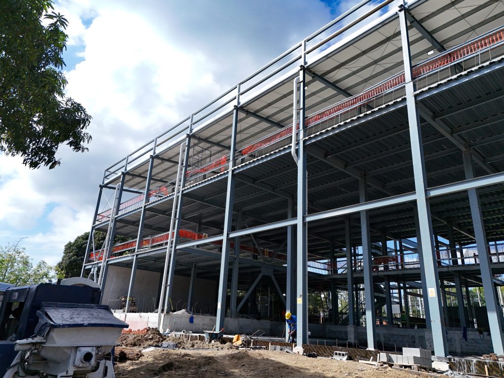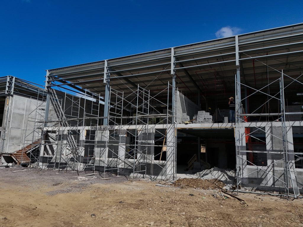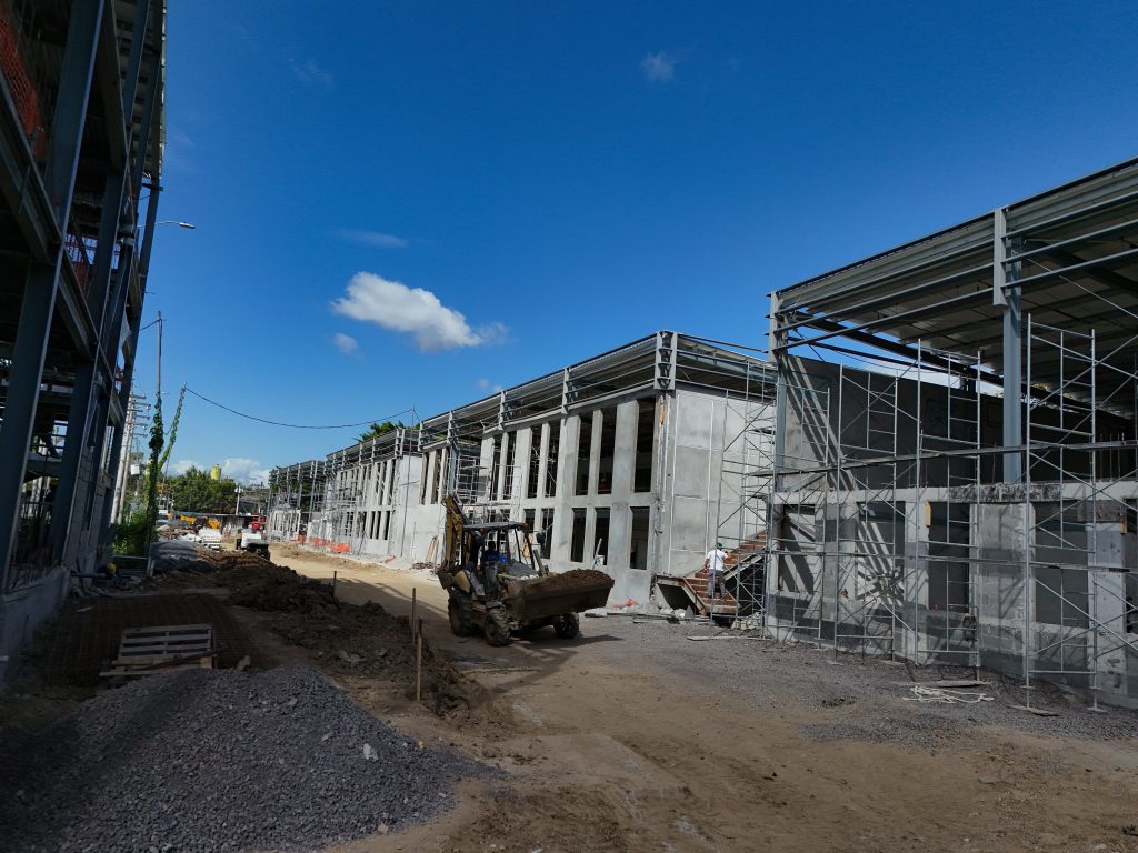 De manera paralela, en los talleres y el almacén se desarrollan trabajos de albañilería, instalaciones eléctricas y plomería, mientras que en el área del hotel se ejecutan labores estructurales correspondientes a fundaciones, vaciado de vigas sísmicas y pedestales, fundamentales para la estabilidad del edificio.